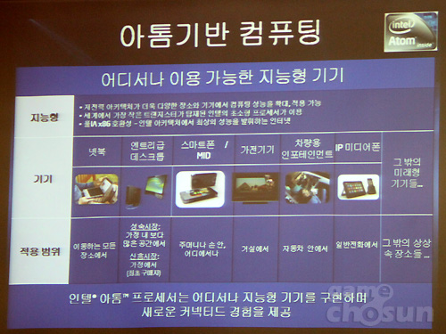 ... 이 자리에 참석한 박성민 본부장은 2011년 태블릿PC와 넷북이 융합된 새로운 플랫폼이 등장할 것으로 예상한다며, 이에 인텔은 반도체칩 하나에 모든 콘트롤 프로세서와 시스템이 내장된 시스템온칩(SOC) 방식의 새로운 아톰 프로세서를 출시할 예정이라고 밝혔다. 또한, 새로운 아톰