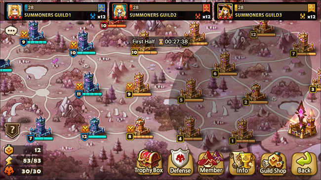 ... 한 길드의 점령지를 나머지 길드가 협동 공격할 수도 있어 심화된 재미를 제공한다. 각 길드에는 본진, 그리고 점령해야 하는 12개 거점이 주어진다. 각 거점에는 최대 5개의 진지(방어덱)를 설치할 수 있으며 상대 거점에 설치된 진지를 모두 무너뜨리면 해당 지역을 점령할 수 있다
