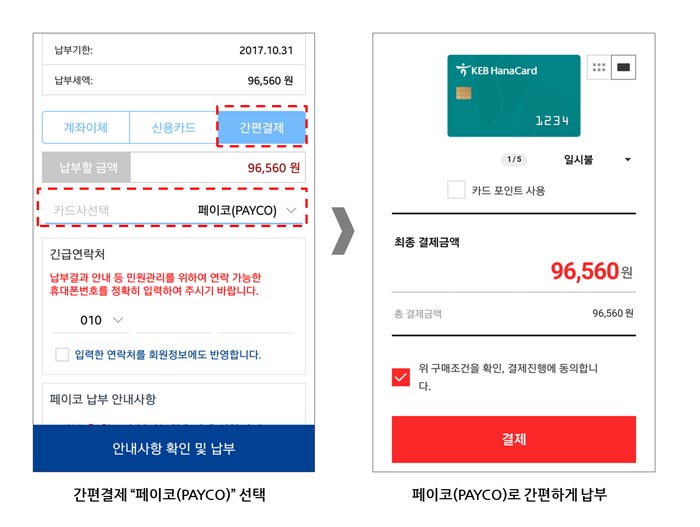 ... <페이코> 납부를 위해서는 간단한 <페이코> 서비스 회원 가입과 함께 신용카드 결제수단 등록이 필요하며, 한번 정보를 등록해두면 비밀번호 입력만으로 결제가 가능하다. <페이코> 납부는 해당 사이트 및 모바일 앱(국세청 홈택스, 스마트위택스