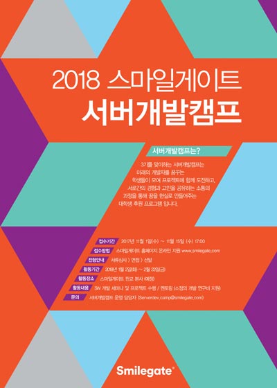 ... 또한 서버개발캠프를 수료 후에도 스마일게이트 개발 멤버십, 인턴십 등 다양한 개발 및 채용 프로그램과 연계해 일회성 교육에 그치는 것이 아니라 참가자들이 개발자로서의 경험을 보다 확대해 나갈 수 있도록 지원 하는 점이 특징이다. 서버개발캠프 지원은 스마일게이트 공식
