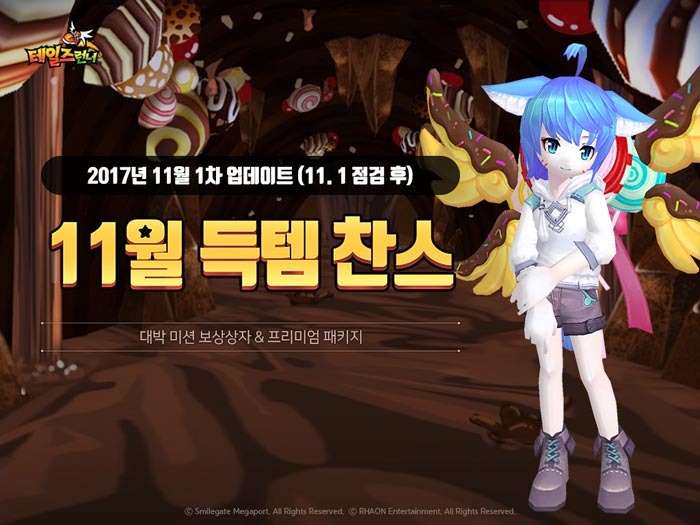 ... 또한, 대박 미션 보상상자에서 대박 미션 보상쿠폰도 있어 추가 아이템을 획득할 수 있다. 또한, 테일즈 프리미엄 패키지도 새로 출시됐다. 해당 패키지에는 테일즈 티켓 이용권 30일, 테일즈 프리미엄 버프 30일, 이달의 뽑기 쿠폰 시즌2 5장, 타임 코인 티켓 5장,