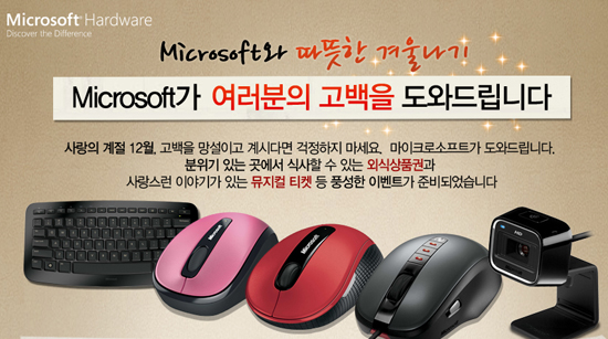 ... 한국마이크로소프트(대표 김 제임스 우)는 연인들의 계절 12월을 맞아 마이크로소프트와 함께 따뜻한 겨울나기 이벤트를 진행한다. 이번 이벤트는 마이크로소프트 하드웨어 제품 구매고객을 대상으로 12월 말까지 진행된다. 행사 기간 중 온라인 쇼핑몰에서 제품을 구매한 고객과 구매후기