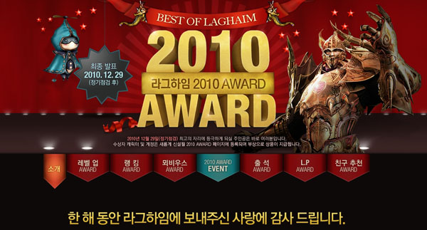 ... 지난 1월부터 오는 12월 29일까지의 성적을 통합해 발표되는 수상자는 '라그하임' 홈페이지에 새롭게 신설된 어워드 페이지에 영구 등록되며 부상으로 게임 내 얻기 힘든 명예 아이템을 지급할 예정이다. '라그하임'은 이번 시상식을 기념한 이벤트로 실시한다. 특히 신규 및 복귀