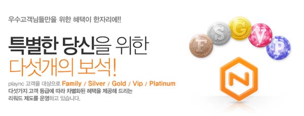 ... 다섯 가지 고객 등급(Family, Silver, Gold, VIP, Platinum)에 따라 매달 혜택과 이벤트가 고객들에게 제공되며, 향후 출시 예정 제품에 대한 고객 등급에 따른 특전도 주어진다. 고객 특전으로 '블레이드앤소울' 등 향후 출시될 게임을 다른 사람들보다 먼