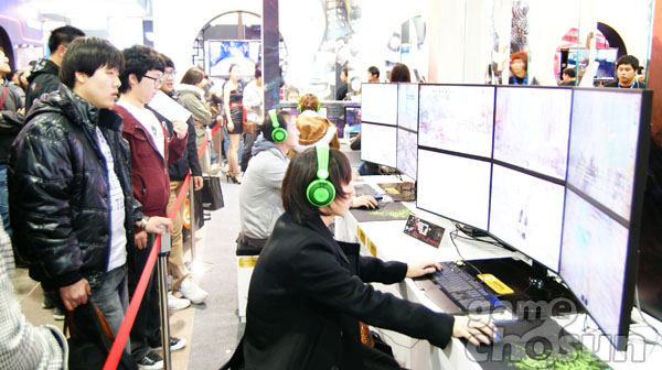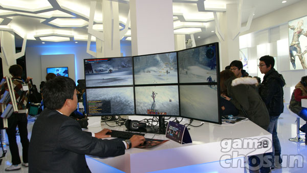 ...18일 개막한 지스타2010 '테라' 부스 1층에 6개의 모니터를 연결한 대형 스크린 시연석에서 시연을 진행해 관람객의 관심을 끌었다. 관람객은 대형 스크린 시연석에서 '테라'의 여덟 가지 직업을 자유롭게 선택해 솔로 플레이 사냥을 체험할 수 있다. ▲ 모니터 6개를 연결한