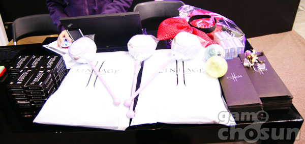 ... 물론 최고 수치 달성 유저 외에 일정 인챈트 수치를 달성하면 미니약과, USB메모리, 캣더캣 후드 티셔츠, 리니지2 프리미엄 우산을 상품으로 지급했다. < 다양한 상품들이 준비되어 있다. > 진행요원의 안내에 따라 최고급 무기를 인챈트하는 유저들의 표정은 가지각