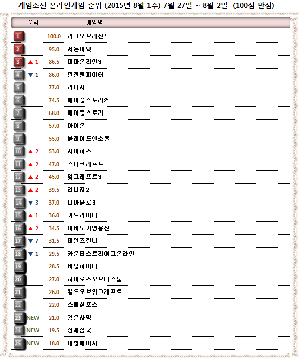 ...5점 차이로 1계단 떨어져 아쉽게 4위를 기록했다. 이번 주 중위권은 '사이퍼즈'를 필두로 2계단씩 오른 게임이 많다. 반면, '디아블로3'와 '테일즈런너'가 3계단, 7계단씩 떨어져 각각 14위, 17위에 머물렀다