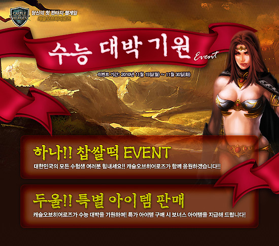...갈라랩(대표 박승현)은 자사가 서비스하는 판타지 웹게임 '캐슬오브히어로즈'에서 수능 수험생들을 응원하고자 수능 대박 기원 이벤트를 실시한다고 15일 밝혔다. 이달 30일까지 진행되는 이벤트는 접속만해도 경험치 2배를 얻을 수 있는 찹쌀떡 아이템을 지급하고 특별 아이템을 구매하는