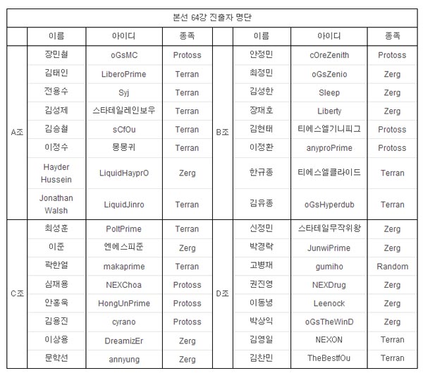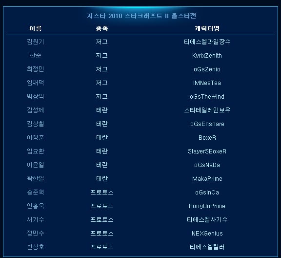 ... 이 대회는 올스타전이라는 명칭에 걸맞게 대진표부터가 화려하다. 자타공인 '스타' 최고의 테란으로 군림했던 '황제' 임요환(T)선수와 '천재' 이윤열(T), 시즌1 우승자 '과일장수' 김원기(Z), 블리즈컨2010 스타2 토너먼트 우승자 '역장술사' 정민수(P), 시즌2 우승자