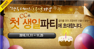 ... 매일 'CC'에 접속해 출석 체크를 하는 유저들에겐 보너스 캐시 및 캐시 아이템도 지급되며, 참여자들 중 추첨을 통해 선발된 4명의 유저에겐 아이템이 지급될 계획이다. 각 필드에 등장하는 몬스터 사냥시 드롭되는 글자가 새겨진 조약돌을 모아 콜오브카오스 1주년 축하라는 글자 조합을