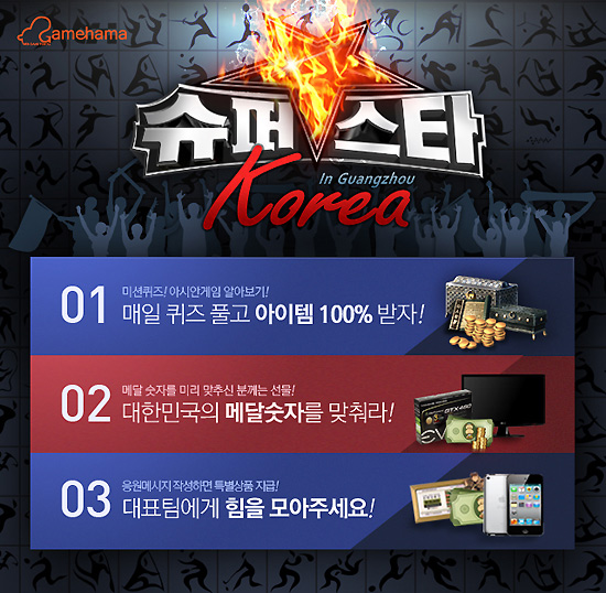 ... 첫 번째 미션은 아시안 게임에 대한 퀴즈로 누구나 미션을 성공할 수 있으며 미션 경품 아이템은 비공개로 참여 익일 오전 10시에 게시판을 통해 공지되는 흥미요소도 가미했다. 두 번째는 대한민국 대표팀이 획득할 수 있는 메달 수를 예상하는 것으로 27인치 모니터, 그래픽 카드,