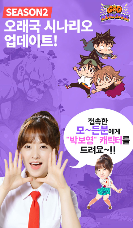 ... 이와 더불어 지난 유저 간담회에서 전달받은 여러 건의사항을 반영해 게임 내 UI 및 일부 시스템들을 개편했으며 '갓오브하이스쿨'의 홍보모델인 배우 박보영의 캐릭터가 추가됐다. 와이디온라인은 박보영 캐릭터 추가를 기념해 성장 이벤트를 오는 31일까지 실시한다. 게임에 접