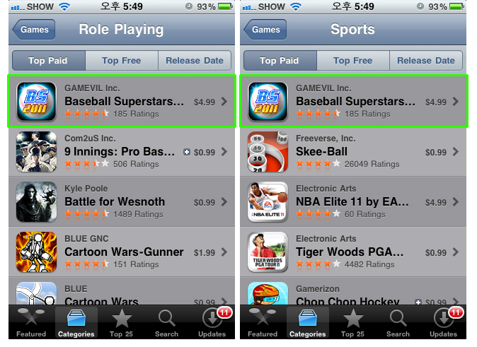 ... 이 게임은 애플의 앱스토어에 출시된 지 이틀 만에 RPG와 스포츠 등 2개 장르에서 1위를 기록한 것. 특히 스포츠와 RPG 장르 Top 10에 오른 대부분의 게임들이 0. 99달러(약 1,000원) 정도의 낮은 가격인데 반해 이 게임은 4
