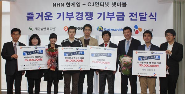 ... '마구마구'에서 512대1의 경쟁률을 뚫고 우승한 닉네임 '0. 372박용택'의 기부금 3천 5백만원은 장애 아동들의 소원성취에, '신윷놀이'에서 우승한 닉네임 ‘♡모♥모♡’의 기부금 3천5백만원은 다문화가정 아동 지원에 전달됐다. 또, 바둑으로 적립된 3천만원은 넷마블