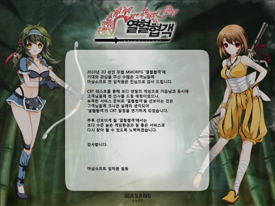 ...손봉호 마상소프트 PM은 "우선 CBT 테스터로 신청해 주신 분들께 일정 지연에 대해 진심으로 사과드린다"며 "내부적으로 많은 고민을 했으나 보다 내실 있는 CBT를 실시하기 위해 일정을 불가피하게 연기하기로 했다"고 전했다. 한편, '열혈협객'은 이달 중으로 CBT를 실시할 예정