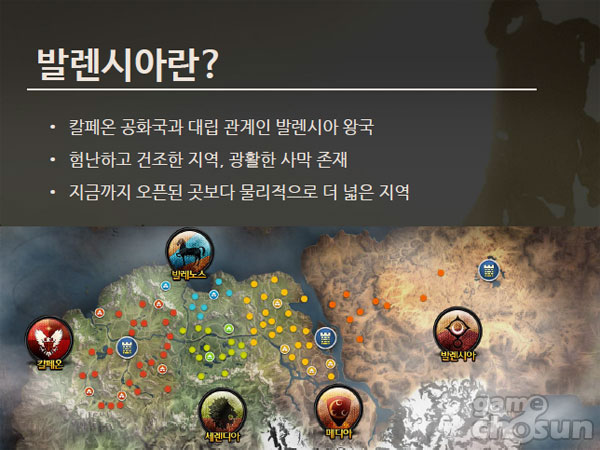 ... 자료 발표는 함영철 다음게임 검은사막 팀장과 고도성 펄어비스 사업 PM이 맡았다. ■ 광활한 사막 존재! 거대 지역 발렌시아 ▲ 발렌시아 훑어보기 영상(롱테이크) 발렌시아는 기존의 발레노스, 세렌디아, 칼페온과 메디아를 합한 지역보다 더 큰 크기를 자랑하는 지역이다