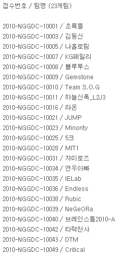 ...이번 경진대회의 1라운드는 지난달 18일부터 22일까지 5일간 홈페이지를 통해 접수했으며 전국에서 50여 개 팀이 XNA, 게임오븐, 카누, 아이폰, 안드로이드 등 플랫폼의 기획서를 응모했다. 전문가들로 구성된 심사위원단의 심층적인 평가를 통해 2라운드 진출작이 선정됐으며 진출작은