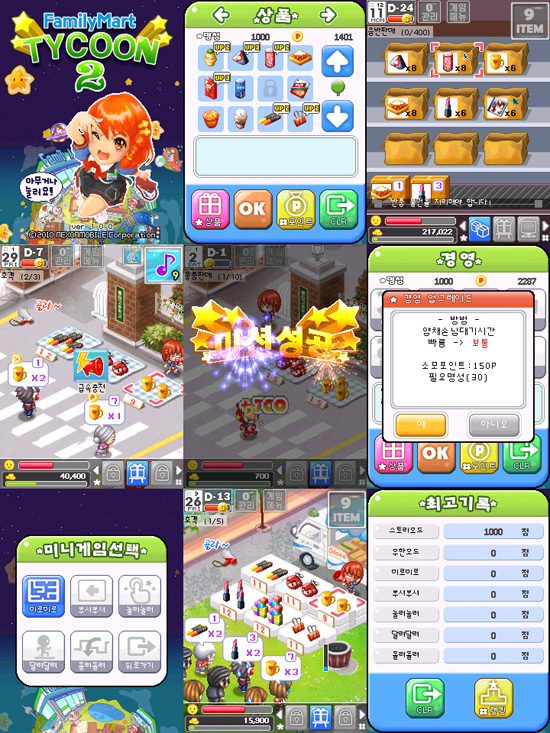 ... 특히 지난 8월 훼미리마트가 개점20년 만에 국내 편의점 프랜차이즈 최초로 5000호점 달성을 기념해 제작됐으며, 실제 BI 및 가맹점 인테리어 디자인을 그대로 게임에 적용했다. '훼미리마트 타이쿤2'는 미션을 수행하며 시나리오를 진행시켜나가는 메인 게임인 스토리모드와 유저들
