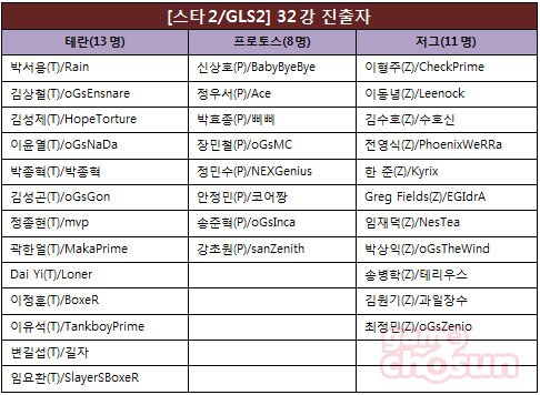 ... 이번 32강전에서 가장 주목할만한 것은 바로 이형주, 김원기 등 저그 유저의 강세이며, 황제 임요환 선수와 천재 이윤열 선수, 불꽃테란 변길섭, 장민철, 그렉필즈 등 스타1 출신 프로게이머들간 우승 경쟁이다. 아래 표는 이번 시즌의 32강 진출자 리스트이다. 1
