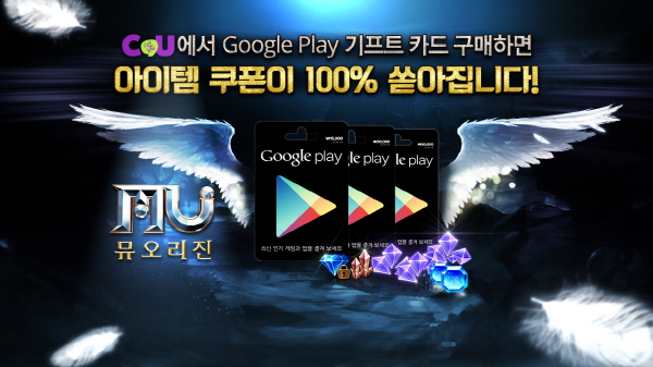... 해당 아이템들은 구글플레이 기프트 카드에 적힌 16자리 번호와 휴대폰 번호를 이벤트 페이지에 등록한 후 문자로 수신된 이벤트 쿠폰 번호를 '뮤 오리진' 게임 내에서 입력하면 받을 수 있다. 단, 해당 쿠폰은 각 금액별 기프트 카드당 1회만 주어진다. 또한, 프로모션 기간