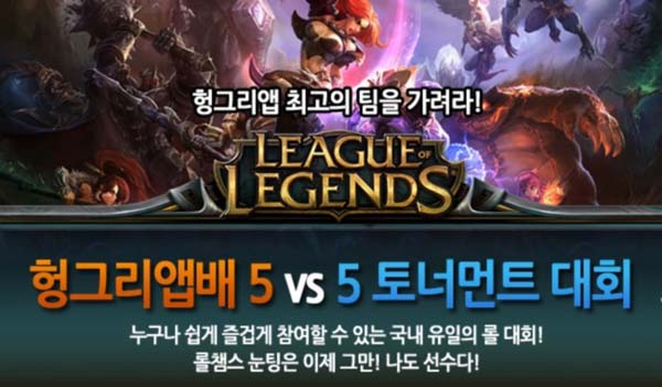 ... 이번 이벤트는 '헝그리앱배 5 vs 5 토너먼트 대회'로 '리그오브레전드 헝그리앱' 커뮤니티에 이벤트 기간 동안 남녀노소, 티어에 상관없이 누구나 자유롭게 참가할 수 있다. 참가자에게는 총 100만 원의 상금을 순위에 따라 차등 지급한다. 본 이벤트의 참가 접수는 7월