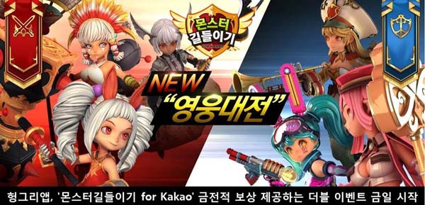 ... 두 번째 이벤트는 '쿵쿵따리 쿵쿵따'로 '몬스터길들이기 헝그리앱' 커뮤니티에서 이벤트 기간 동안 '쿵쿵따' 게시판에 끝말잇기 게임을 진행하면 참가자 전원에게 밥알 포인트를 지급한다. 본 더블 이벤트는 7월 16일 오전 9시까지 진행하며 자세한 내용은 '몬스터길들이기