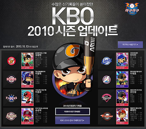 ... 2010 선수 카드 중 최고의 카드는 단연 롯데 이대호 선수 카드다. 9경기 연속 홈런으로 세계 신기록을 세우고 타격 부문 7관왕을 달성하며 자타공인 최고의 타자 자리에 오른 이대호 선수는 무려 3년만에 등장한 엘리트 등급의 영광을 부여 받았다. 이외에 SK 김광현, 삼성