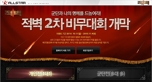 ... 통합 서버인 적벽 서버에서 열리는 이번 비무대회의 개인전 및 군단전에 참여하고 싶은 유저들은 20일까지 홈페이지를 통해 신청할 수 있다. 개인전은 26일에 32강 예선전이 시작돼, 11월 9일 최종 결승전을 통해, 위, 촉, 오 삼국 전체의 최고 1인을 가릴 예정이다. 군단전은