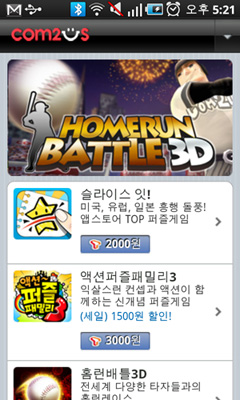 ...com2us. com)에서는 국내 오픈마켓에서 서비스 되고 있는 안드로이드폰용 게임인 '슬라이스 잇!'과 '홈런배틀3D' 등을 비롯한 총 16종의 컴투스 게임 정보를 확인 할 수 있다. 이번 모바일 웹사이트 개설로 안드로이드폰 유저들은 복잡한 절차 없이 스마트폰을 사용하여 손쉽게