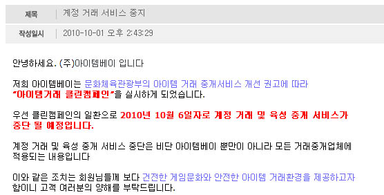 ...6일부터, 아이템 현금 거래 사이트에서 "계정거래 및 육성 중개 서비스'가 중단된다. 이는 문화체육관광부(이하 문화부)에서 추진 중인 '아이템거래 클린캠페인'을 일환으로 문화부의 거래 중개서비스 개선 권고를 모든 거래중개업체가 수용에 나선 것. 문화부는 지난해 말부터 '게