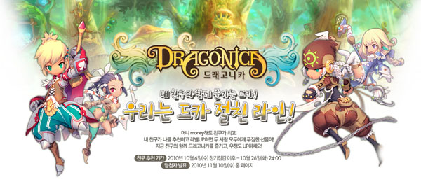 ... 6일부터 시작되는 신규이벤트 2종은 로 친구와 함께 즐길수록 더욱 큰 보상을 주는 드카 절친 라인 이벤트와 정해진 시간에 각종 상식을 OX퀴즈로 풀어보는 서바이벌 OX 퀴즈 이벤트이며, 이를 통해 문화상품권과 게임캐시및 게임 내 아이템을 지급 할 예정이다. 이 같은 이벤트를 통