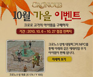 ...㈜게임온 스튜디오(대표 김종창)에서 서비스하는 MMORPG '크로노스'가 가을을 맞이하여 가을 아이템 대 방출 이벤트를 실시한다. 가을 아이템 대 방출 이벤트는 6일부터 27일까지 3주간 실시되며, 이벤트 기간동안 이용자들은 크로노스성 분수대에 위치한 대왕 피그미 NPC를 통해
