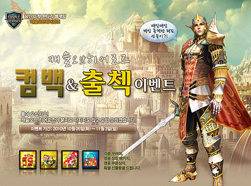 ...㈜갈라랩(대표 박승현)은 자사가 서비스하는 판타지 웹게임 '캐슬오브히어로즈'에서 신규와 휴면 게이머들을 위한 다양한 이벤트를 11월 3일까지 실시한다고 밝혔다. 이번 이벤트는 신규 및 휴면 회원들에게 각각 게임 정착에 도움을 주는 유료 아이템과 2만원 상당의 영웅 성장 패키지를