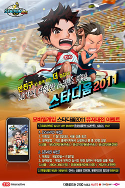 ... 오는 11월 13일 서울 서대문구 신촌 토즈에서 진행되는 '스타디움2011' 오프라인 대회는 참가 신청자 중 선별된 30명의 게이머들이 모여 진행될 예정이다. 이 대회에 참여한 모든 게이머들에게 문화상품권 2만원권을 제공하며, 네트워크 대전 최종 우승자는 30만원, 준우승자는