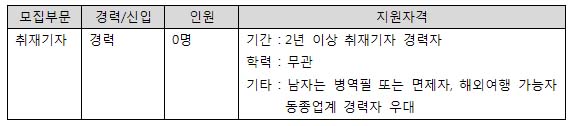...1등 게임미디어를 지향하는 디지틀조선게임에서 급변하는 미디어 환경에 적극 대응하고자 다음과 같이 열정과 능력을 갖춘 인재를 모집합니다. ◈ 제출서류 - 입사지원서 1부 ( 지원서 다운로드 후, 사진 첨부 )- 자기소개서 1부 ( 1-2장 분량으로 경력중심 상세기재, 연락 처/희