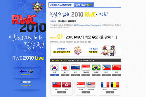 ... 이외에도 RWC 기념 한정 아이템 '가루다 햇'을 출시한다. 이 아이템은 뛰어난 성능으로 유저들에게 많은 인기를 얻을 것으로 보인다. 이와 함께 본선 경기 당일인 10월 2일과 3일에는 인터넷 방송 '아프리카TV'와 '유스트림'을 통해 생중계한다