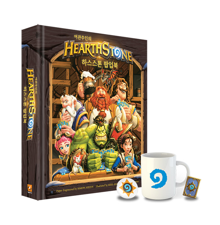 ...게임의 마스코트 '여관주인'의 설명을 곁들인 이 책은 여관 내 풍경과 9명의 영웅, 게임판, 카드 팩 개봉 모습 등을 입체적으로 담아냈다. 각 페이지에는 손으로 움직일 수 있는 조작 요소가 숨겨져 있는 것이 특징이다. 출간을 기념해 온라인 서점에서 귀환석 머그컵, 하스스톤 배지,