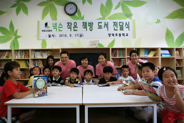 ... 넥슨은 이번 행사를 통해 부산 양덕초등학교와 백양초등학교에 각 16, 17번째 넥슨 작은 책방을 개설하고, 단지 도서뿐만 아니라 책장, 서가 등을 함께 기증해 도서 공간도 한층 쾌적하게 단장했다. 넥슨 작은 책방은 사회 공헌 활동의 일환으로 기획된 릴레이 형식의 기업 캠페인이다