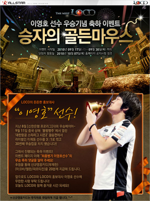 ... 특히 이번 경기에서 이영호 선수는 스타리그 사상 2번째로 3시즌 연속 결승전에 진출하는 기록을 세웠으며, 이윤열, 박성준, 이제동에 이어 4번째로 골든마우스의 주인공이 되는 영광을 안았다. 이에, KTH '로코'는 공식 홍보대사인 이영호 선수의 우승과 골든마우스 획득을 축하하는