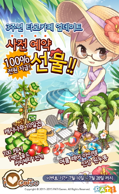 ... 한편, 지난 2012년 7월 정식 출시된 '아이러브커피'는 출시 3주년을 맞이해 신규 테마 '리조트 테마'와 3주년 기념 한정 메뉴 등을 추가하고 여름 분위기를 느낄 수 있는 새 BGM(배경음악)으로 교체하는 등 신규 콘텐츠를 업데이트했다. [조상현 기자 neulpeum@c