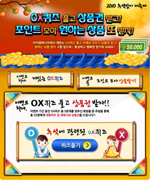 ... 추석에 관련된 간단한 OX퀴즈가 이벤트 페이지에서 제출되며, 총 5문제를 맞춘 회원에게는 홈플러스 상품권,신세계 상품권,재래시장 온누리 상품권,롯데백화점 상품권,농협 상품권 각 5만원 권이 증정될 예정이다. '포인트 모아 상품받기'는 지금까지 회원들이 모아온 포인트를 통해 일