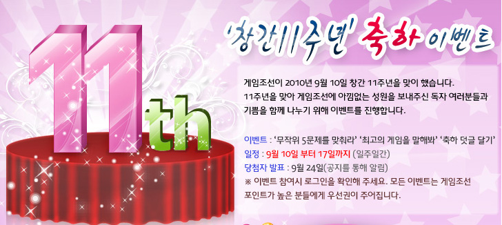 ...게임조선이 2010년 9월 10일 창간 11주년을 맞이 했습니다. 11주년을 맞아 게임조선에 아낌없는 성원을 보내주신 독자 여러분들과 기쁨을 함께 나누기 위해 이벤트를 진행합니다. ☞ 창간 11주년 축하 이벤트 참여하러 가기 [게임조선 편집국 gamedesk@chosun