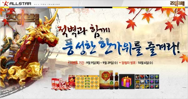 ... 우선, 이벤트 기간 동안 웹사이트를 방문한 유저에게 하루 한 번씩 게임 아이템을 지급하고, 추첨을 통해 고급 기름세트와 캐시아이템을 추가 지급한다. 또한, 게임 속 하늘에 떠있는 보름달을 스크린샷으로 담아 소원과 함께 게시판에 등록하는 ‘소원빌기’ 이벤트 및 ‘한’, ‘가’,
