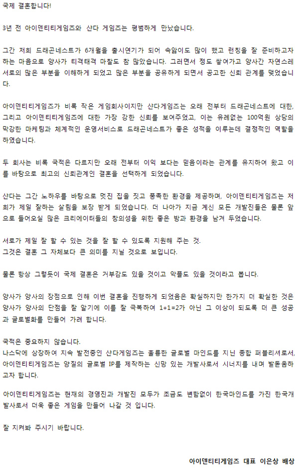 ... 이은상 아이덴티티게임즈 대표 이번 인수와 관련해 "두 회사는 이익보다는 믿음이라는 관계를 유지하여 왔기에 결혼을 선택하게 됐다"며 "양사의 단점을 잘 극복해 더 큰 성공과 글로벌화를 만들어 갈 것"이라고 말했다. 또, "변함없이 한국마인드를 가진 한국개발사로서 더욱 좋은 게