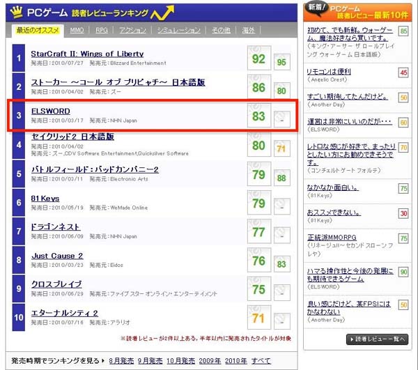 ...4gamer. net)에서 실시한 PC게임 유저 리뷰 랭킹에서 3위를 차지하였으며, 게임 사이트 onlinegamer(www. onlinegamer