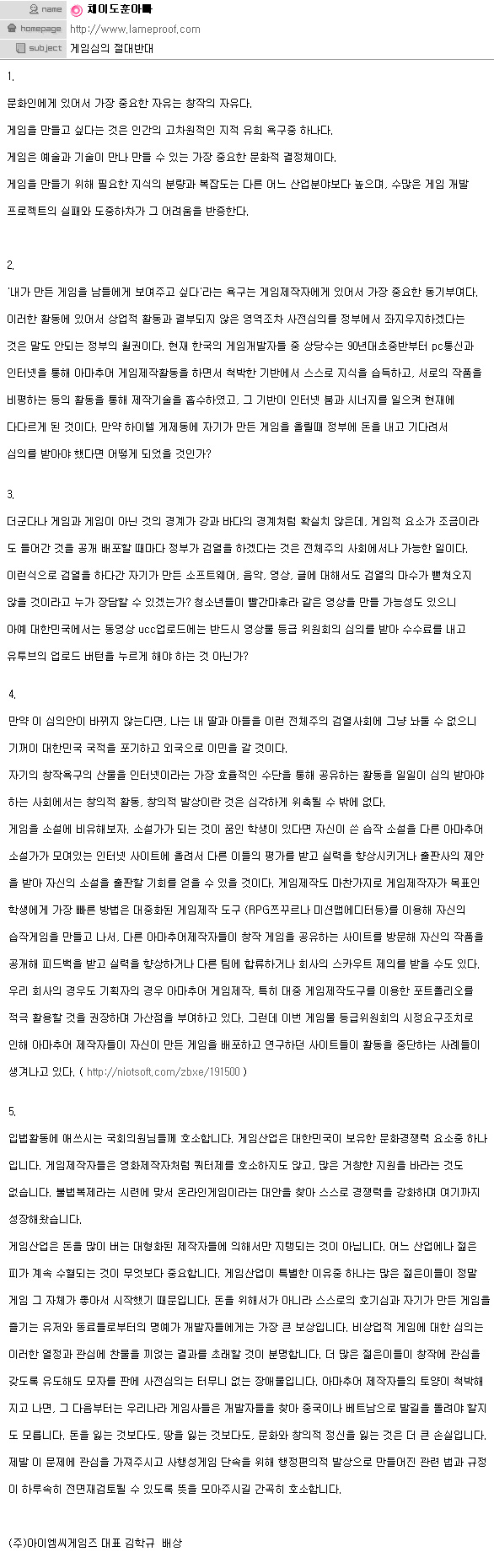 ...lameproof. com)를 통해 최근 논란이 되고 있는 게임위의 사전심의안은 '창작의 자유와 게임제작자의 동기부여를 꺾는 장애물'이라고 정의한 뒤 사행성게임 단속을 위해 행정편의적 발상으로 만들어진 관련 법과 규정이 하루속히 전면 재검토 될 수 있도록 뜻을 모아주길 호소했다.