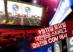 ...세계에서 가장 큰 스크린이 설치된 영화관인 영등포 ‘타임스퀘어 CGV 스타리움관’은 현장을 찾은 E스포츠 팬들에게 대형 스크린과 최고의 음향 시설로 박진감 넘치는 경기를 선사할 예정이다. 또한 현장 관객 전원에게는 16일 개봉하는 주진모, 송승헌 주연의 영화 ‘무적자’ 예매권을 무