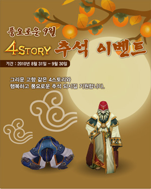 ... 또한 '4스토리' GM의 블랙마켓이 2주간 월요일 오후 7시부터 24시간 동안 열리며, GM의 블랙마켓에서는 그 동안 얻을 수 없었던 이벤트 아이템들을 구매 할 수 있다. 추석 맞이 이벤트와 관련된 자세한 사항은 '4스토리' 홈페이지(www. 4story