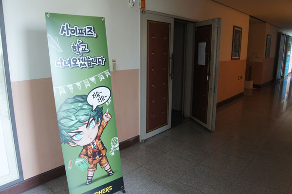 ...▲ 울산애니원고등학교 전경▲ 학교 입구에 들어서면 마스코트가 자리 잡고 있다. ▲ 강연이 한창 진행 중인 행사장▲ 애니원고 학생들은 대부분 사이퍼즈를 즐겨하고 있었다. ▲ 강연에 집중한 학생들▲ 사이퍼즈 리그전을 준비 중인 학생들▲리그에 앞서 몸풀기를 하고 있는 학생[조상현 기자