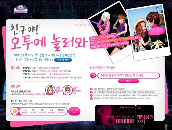 ... 먼저, 이벤트 기간 동안 친구의 초대를 받고 신규 캐릭터를 생성한 신규 유저에게는 나를 초대한 친구의 캐릭터 명만 입력하면 오디션2의 이벤트 한정 아이템인 ‘브라운 러블리 셋팅헤어(7일권)’가 100% 지급된다. 또, 기존 유저에게는 초대한 친구가 자신의 캐릭터 명을 입력 할